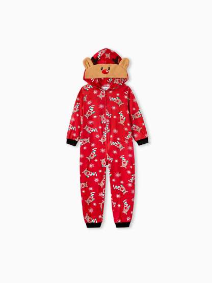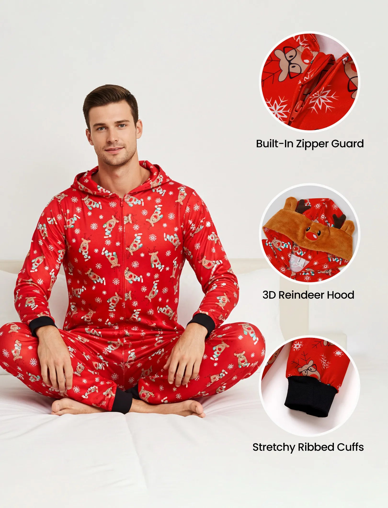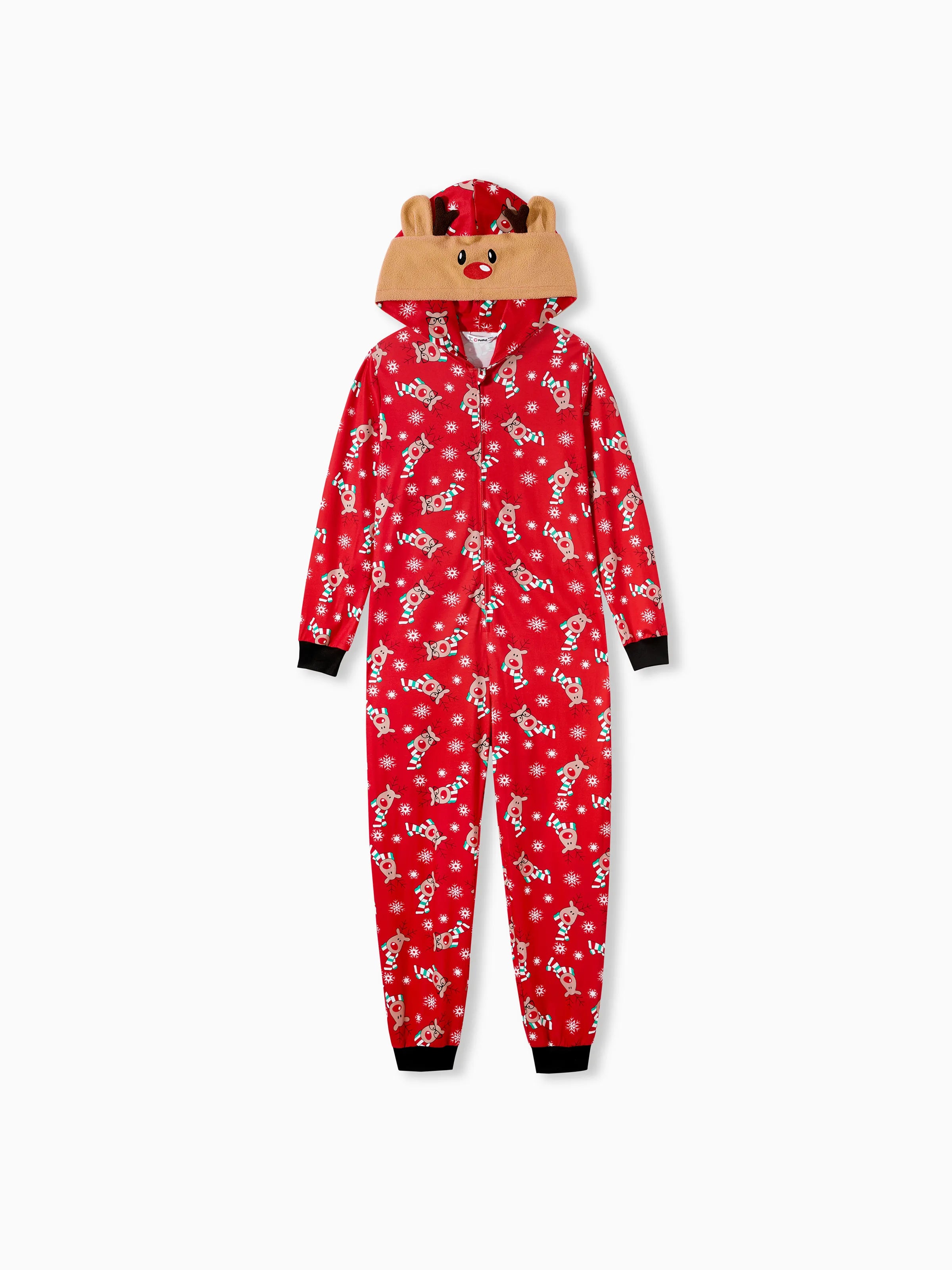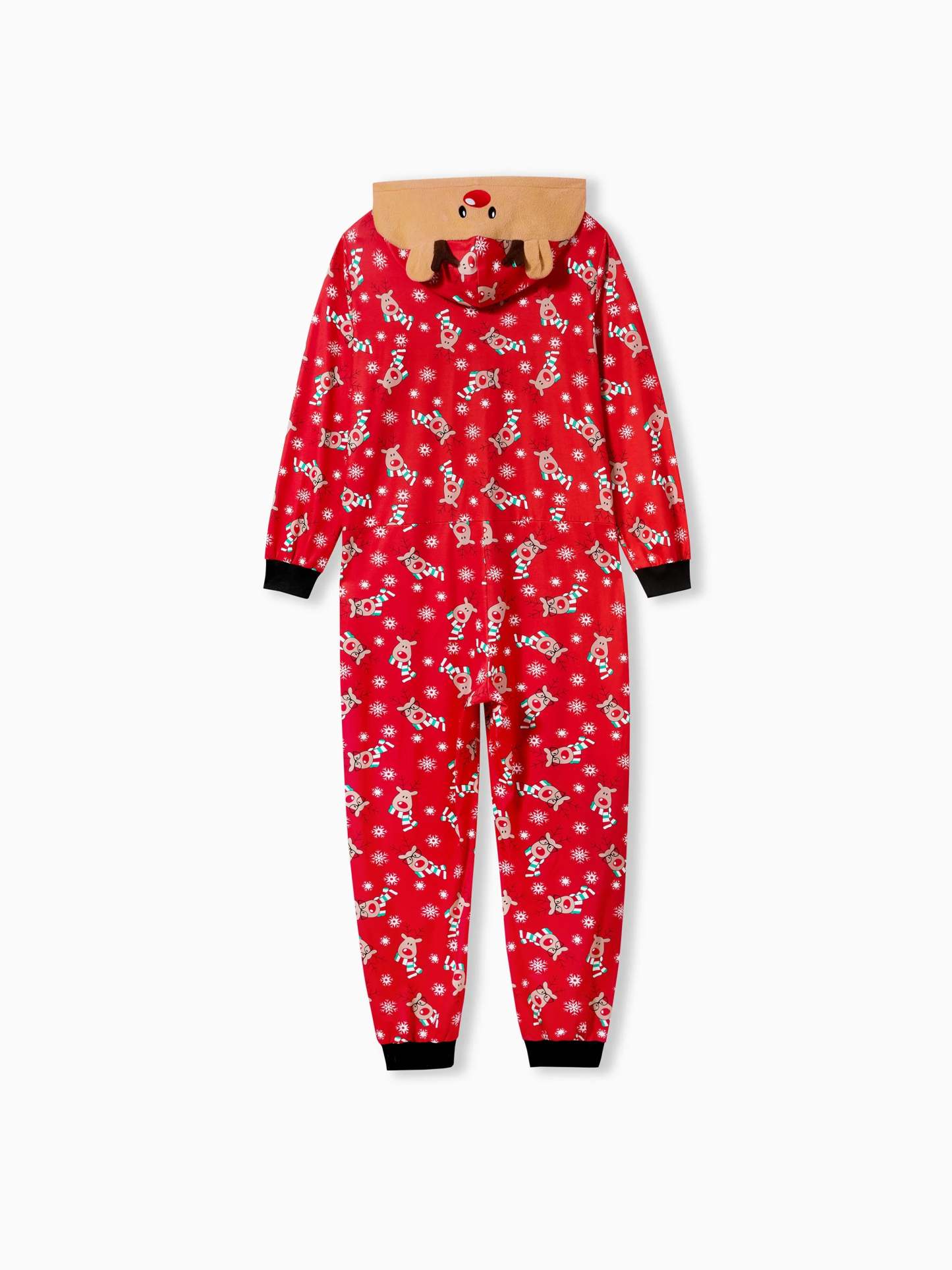 Christmas Matching Family Pajamas Set 3D Reindeer Hooded Allover Reindeer Print Onesie PJS with Christmas Socks Red