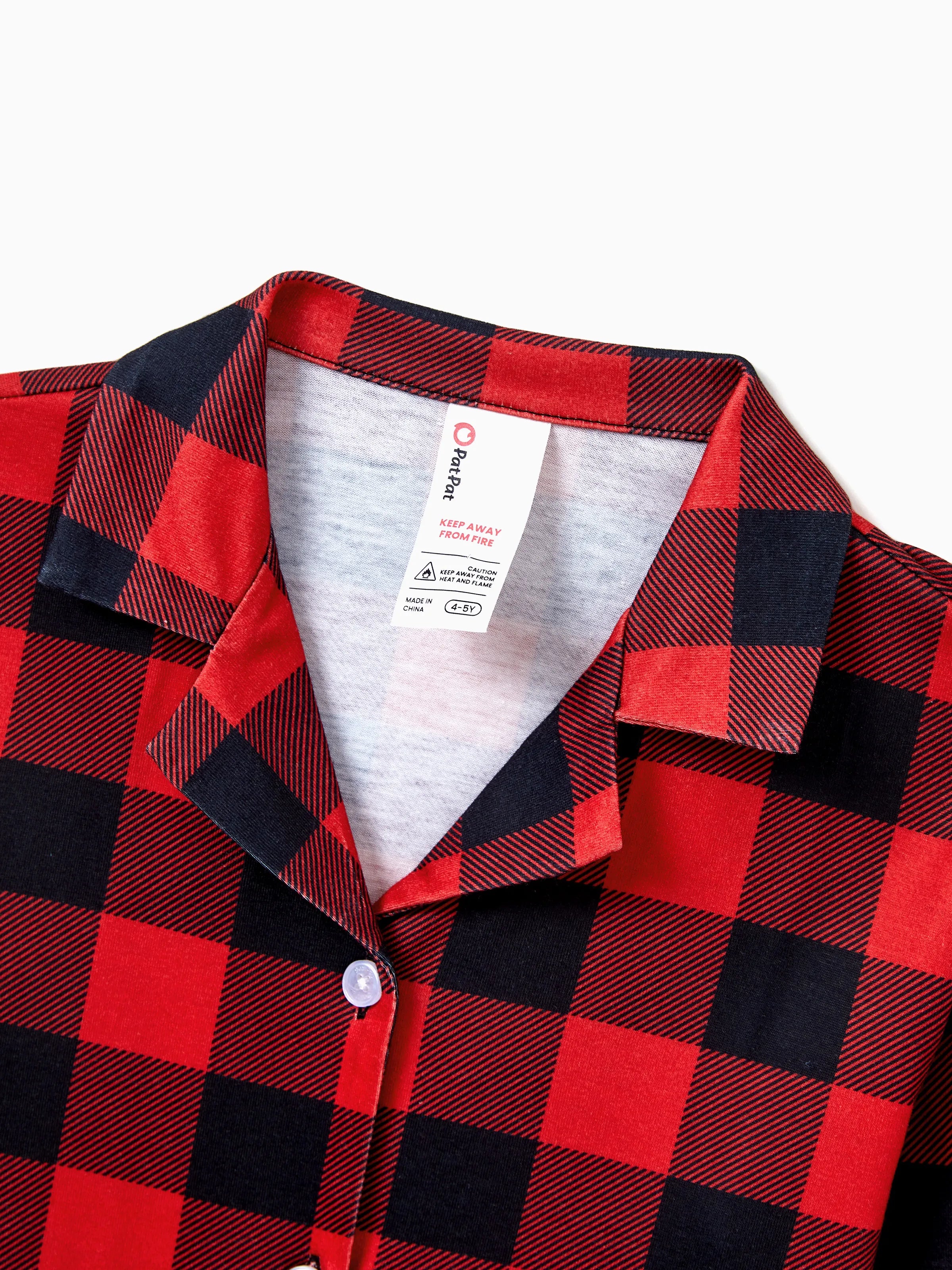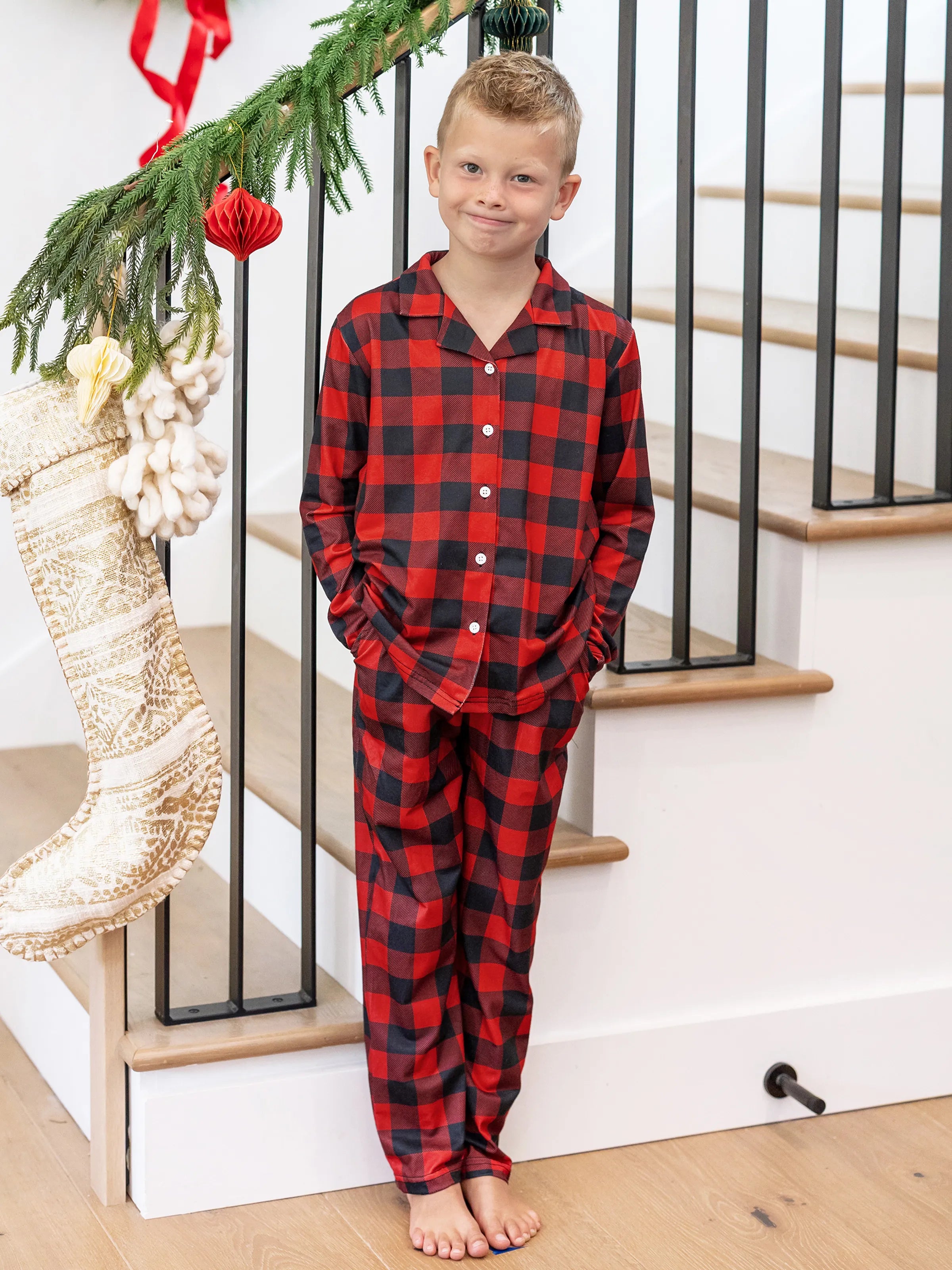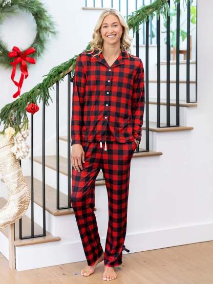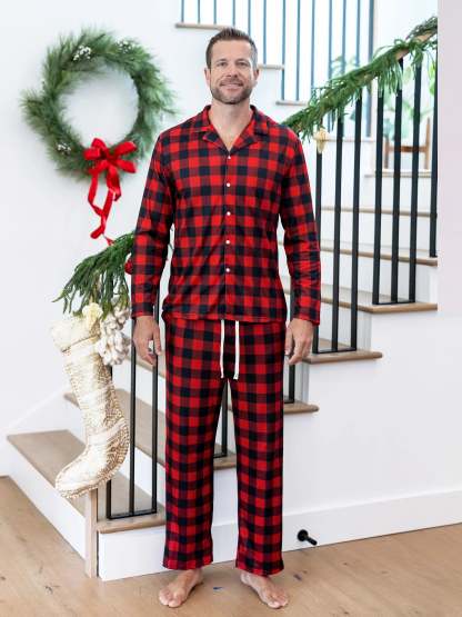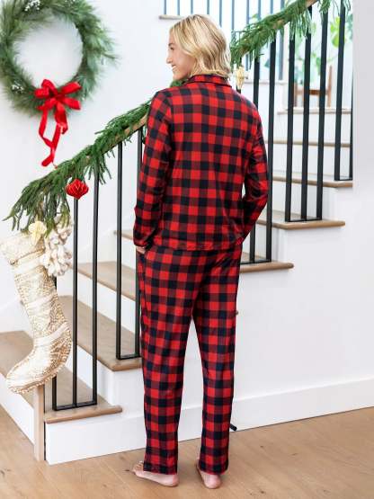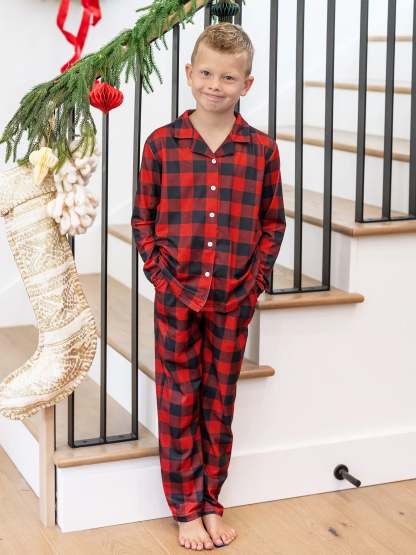 Cozy, flame-resistant matching pajamas with festive buffalo plaid for joyful nights.