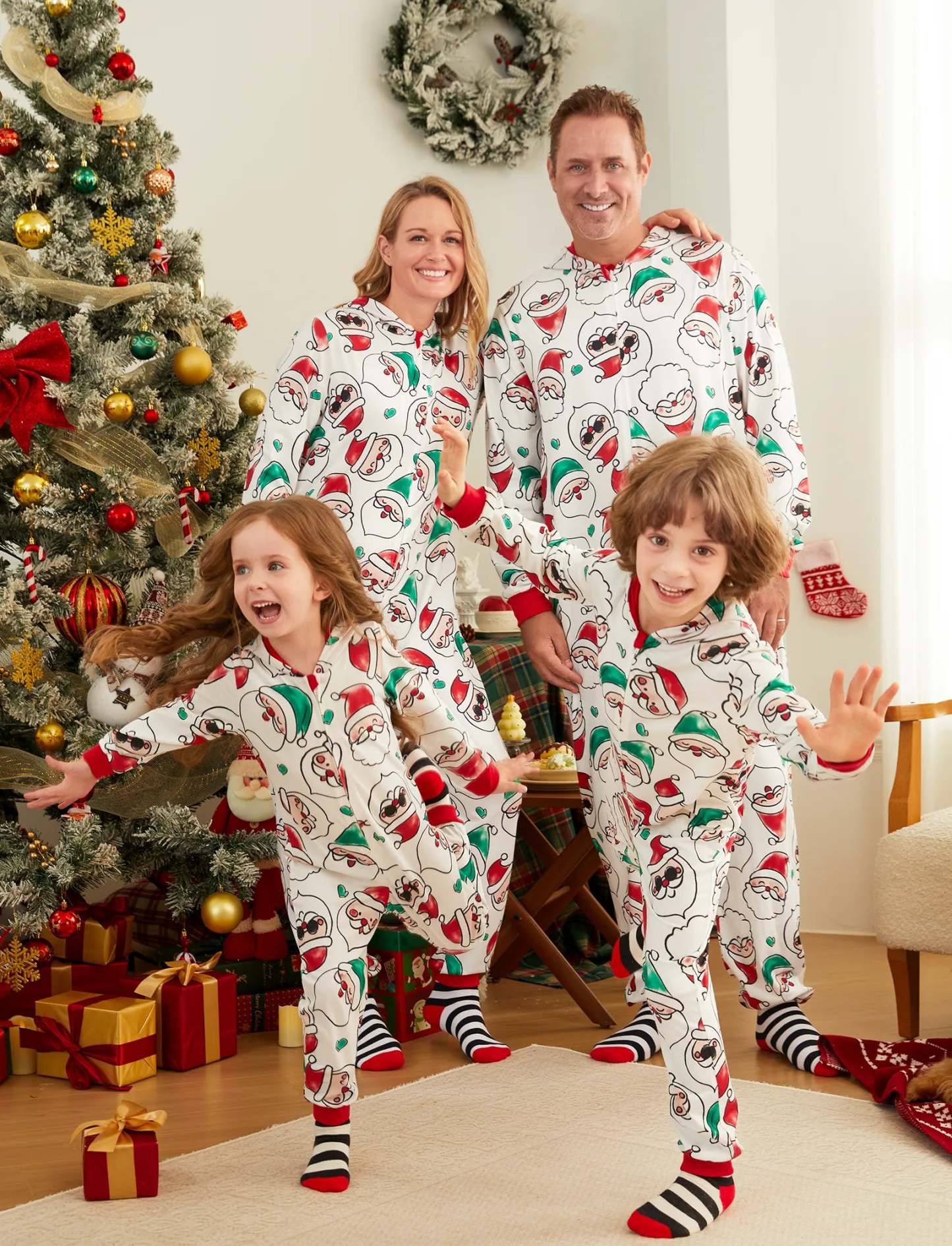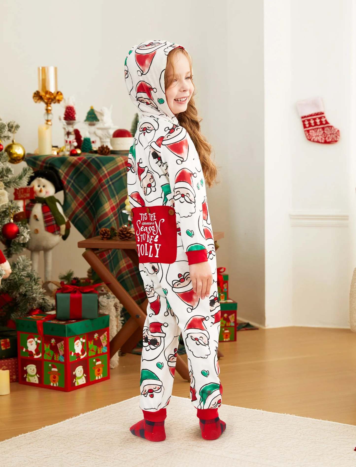 Christmas Matching Family Pajamas Set Santa Claus Allover Print Hooded Onesie PJS with Christmas Socks ColorBlock