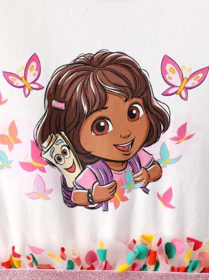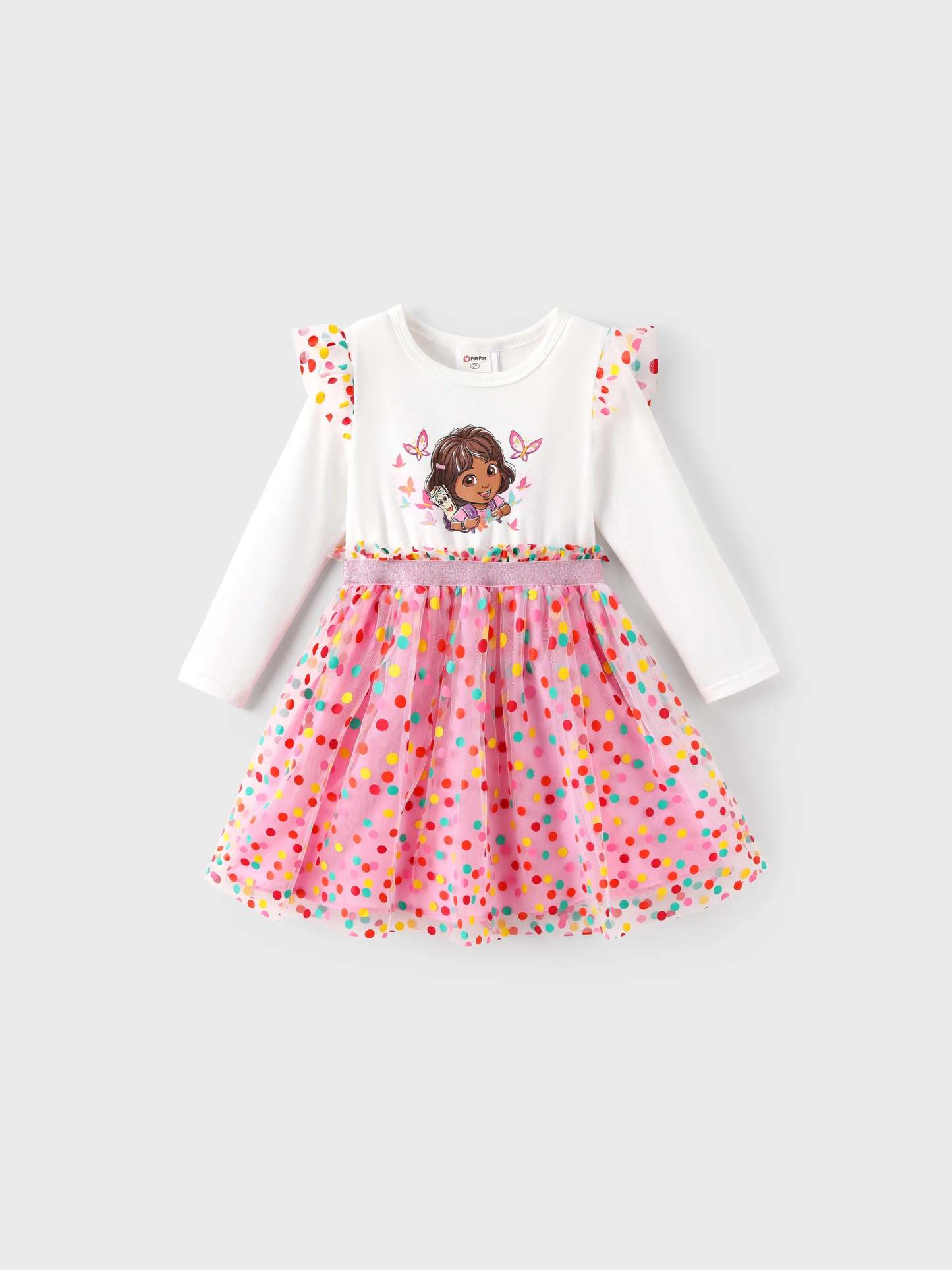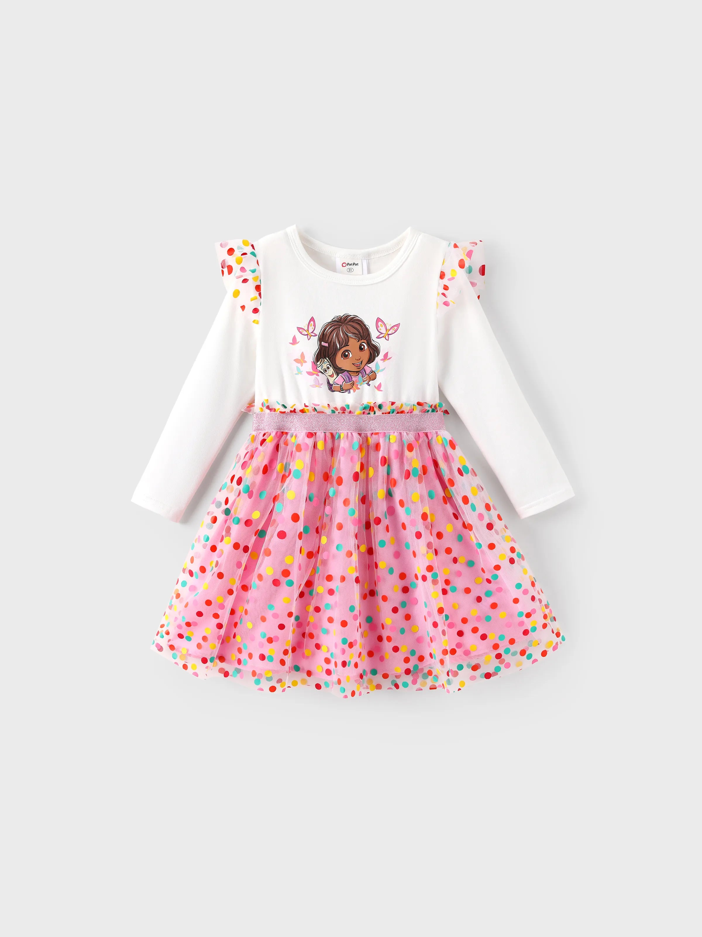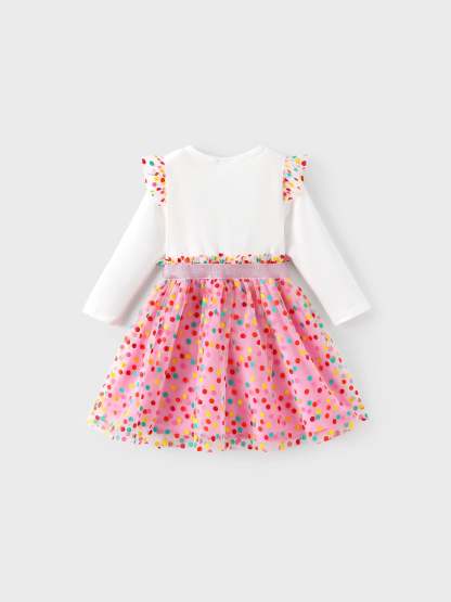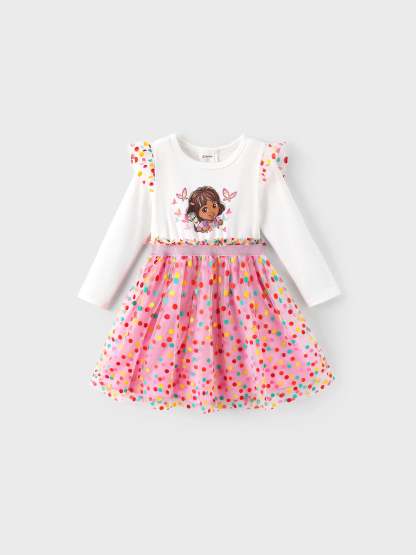 Soft cotton knit long sleeve dress featuring Dora series pattern and colorful polka dot mesh skirt for a sweet and charming look.