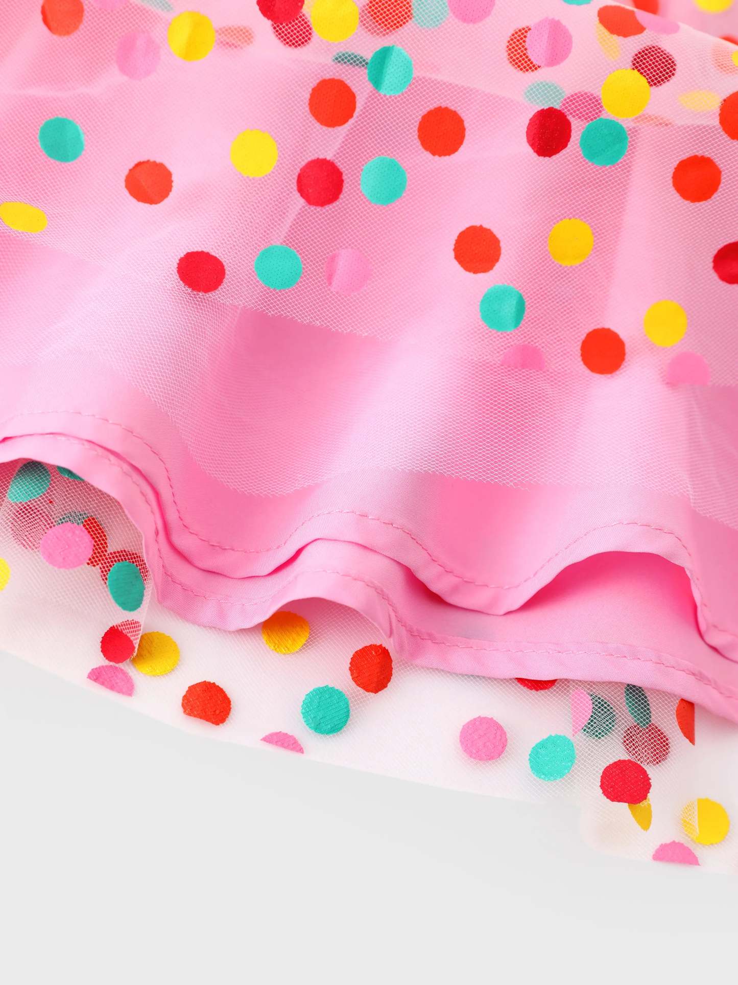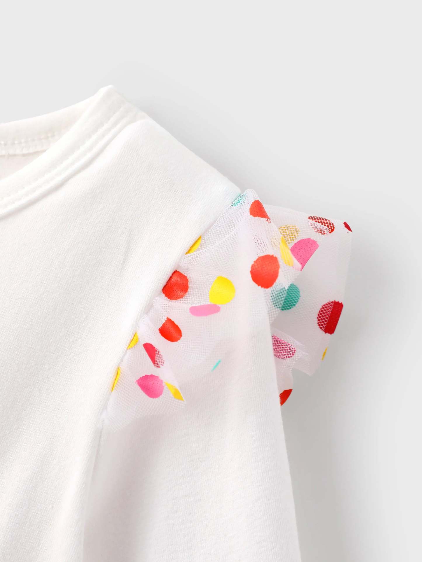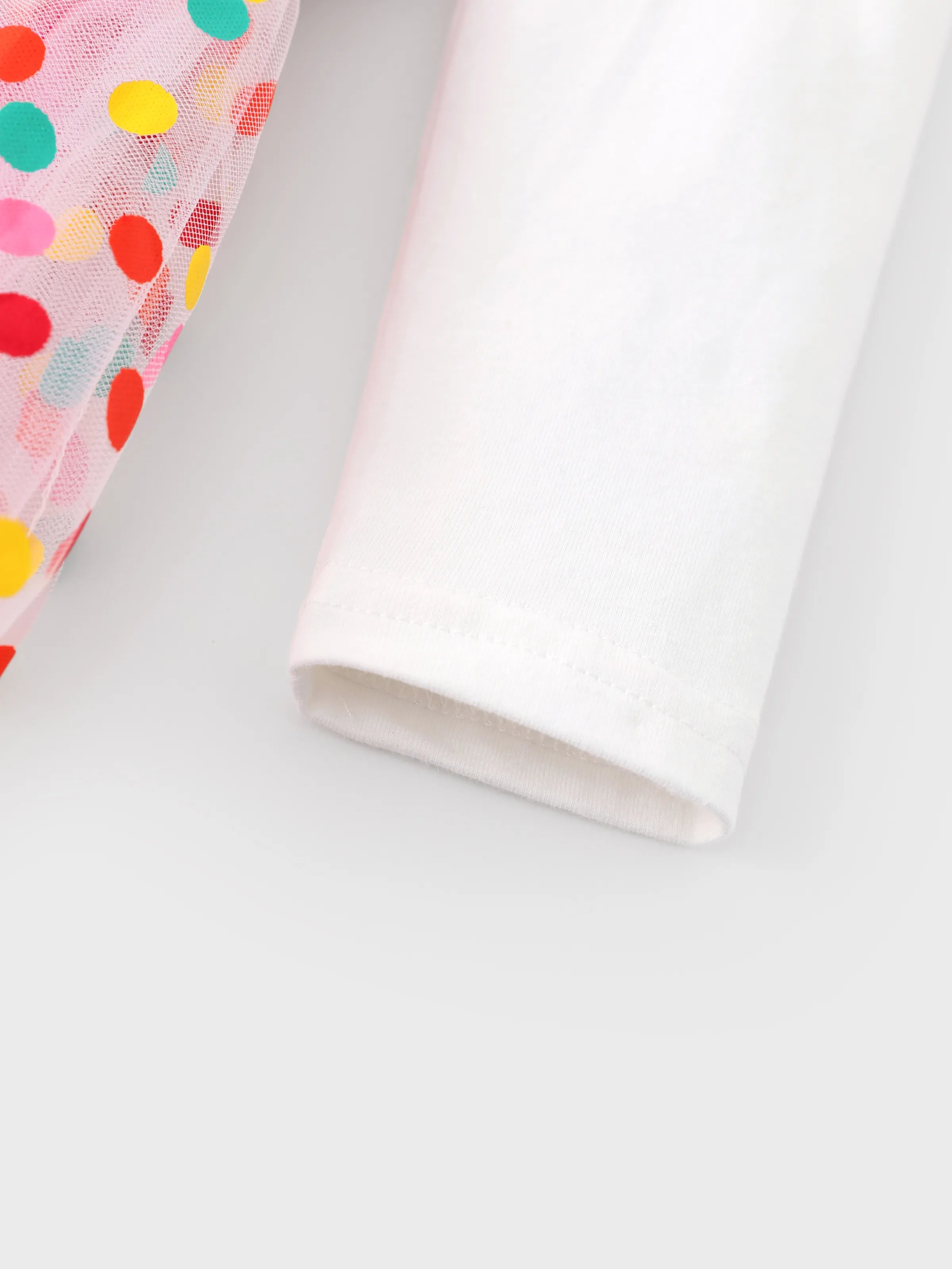 Soft cotton knit long sleeve dress featuring Dora series pattern and colorful polka dot mesh skirt for a sweet and charming look.