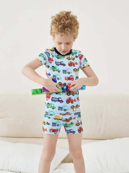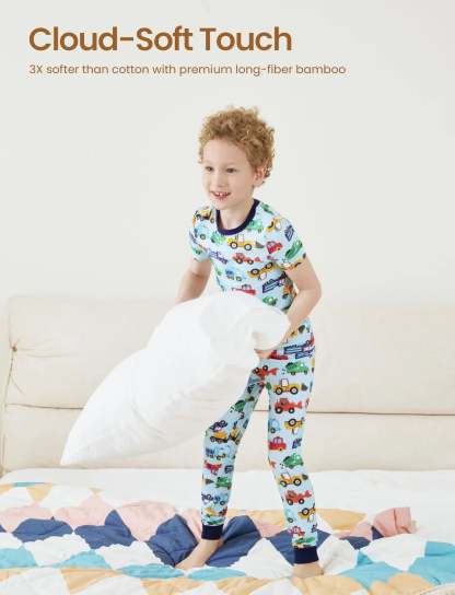 【Why Bamboo Viscose】No use of flame retardants,no fertilizers,faster growing than other land plant,lower carbon footprint than cotton farming.It is a grass and dose not need to be replanted.With its cloud-like softness, breathable comfort, lightweight and gentle on your kids sensitive skin, it has become a go-to choice for those who value both luxury and sustainability.【Smart 3-Piece System】Buy 1, Get 2 Looks, ready for Any Season. Includes 1 short-sleeve top + 2 mix-and-match bottoms (shorts & pants) that grow with kids from 2T to 12Y. Hidden expandable waistbands accommodate growth spurts, while tagless labels prevent itchiness.【Tailored for Tiny Moves】Signature slim-fit design, elasticized cuffs that stay put without binding. Not too tight, not too loose - just right for all-day zoomies.【Bedtime Adventures Awake】 Choose from our magical prints collections - dive with shark in Ocean, tame dinosaurs in Jungle, or soar through galaxies in Cosmic. Each graphic-printed pajama sparks imagination while helping kids wind down, turning bedtime resistance into -Just 5 more minutes of dreaming.【Holiday Pajamas for Kids】With child safety in mind, our pajamas are snug-fitting, avoiding the risk of loose garments catching fire. Our boys' pajamas and girls' pajamas are free from flame retardants, making them the ideal surprise for kids.